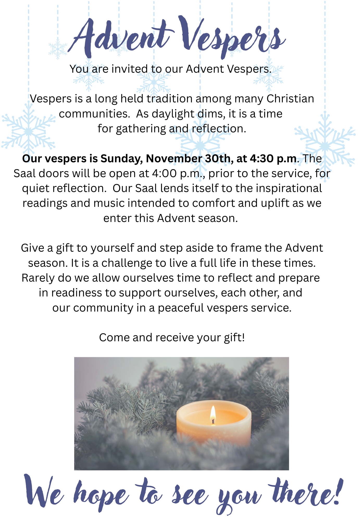 - Sunday, December 21, 4:15pm: Home Church Family Lovefeast Prelude.