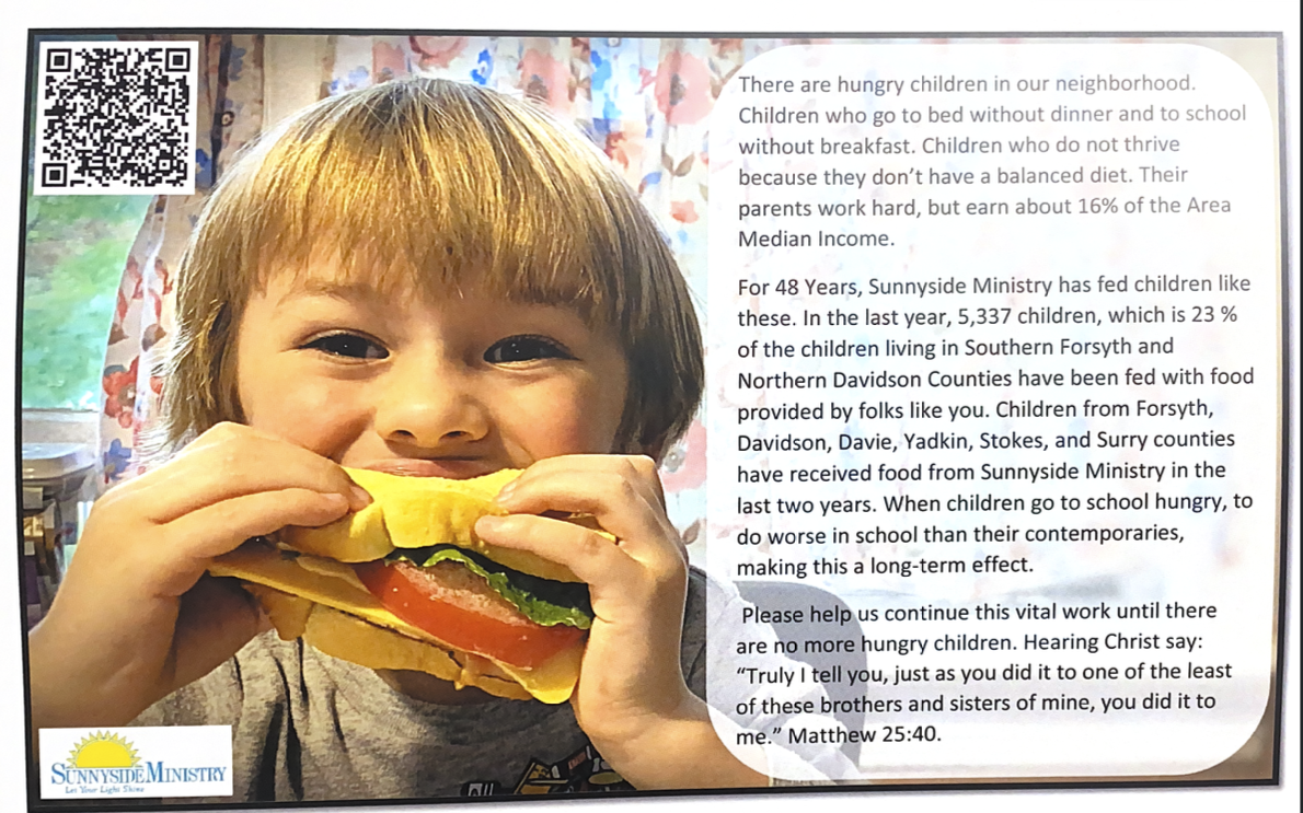 The Sunnyside Ministry Food Drive will be held Sunday, November 23; please bring non‑perishable food items.