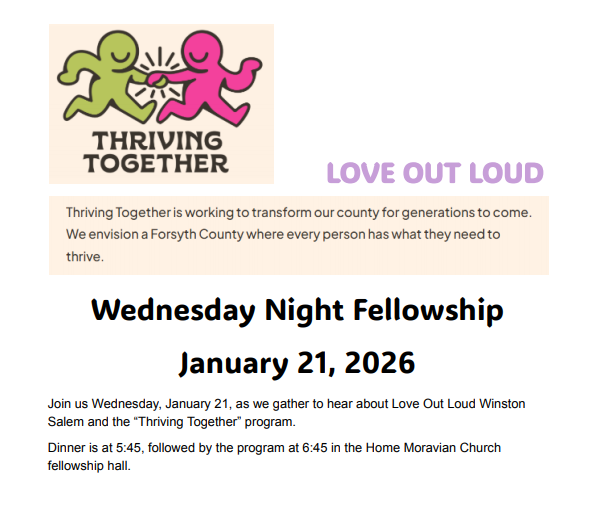 Pennybyrn, a Continuing Care Retirement Community in High Point (similar to Salemtowne), has invited us over to learn more about Moravians. We will do that by providing a lovefeast in their independent living section. We expect 100 attendees. We need servers/dieners and singers.