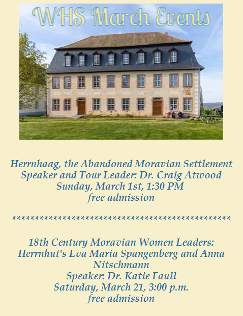 March is a great time to come out and hear two lectures on Moravian History sponsored by the Wachovia Historical Society and Home Moravian Church.